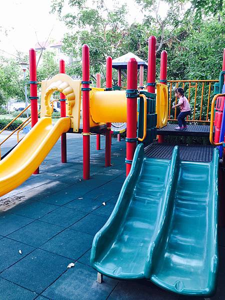 1Y8M的胡小梨晉升好動皮蛋了⋯每天上午放風一次,下午午覺完吃點心又要再出去放一下電⋯⋯家附近的兩個小公園已經滿足不了她了~前一陣子都開車帶她去英才公園玩,剛開始被兩個溜滑梯吸引,玩的很開心,幾次下來又膩了(是有多喜新厭舊呀!這個老嬰兒=,=)今天上午爺爺陪著一起去英才公園發現小傢伙溜滑梯也不專心,一副不太有趣的樣子,下午就說要帶梨子去新的公園玩~我原本想公園不就那樣⋯殊不知下午我也驚艷了! 這個公園的溜滑梯大多了,玩的方法也比之前的公園多~ 兩個溜滑梯中間用爬的,也可以從後面攀爬上來再走過吊橋去溜~小皮蛋玩的不亦樂乎!經過中間的隧道還會叫我看她^^